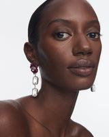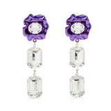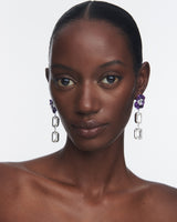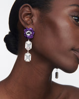The Ada Crystal Earrings are sparkling drop earrings featuring two emerald cut crystals suspended from an intricate metallic purple setting with an oval crystal center.