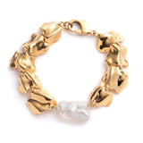 The Vertebrae Bracelet is a gold-plated bracelet comprised of nine hand-carved anatomically inspired links. Each link is unique, just like the cultured pearl.