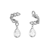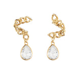 The Warp Chain Pearl Earrings feature a dimensional curved gold chain with oversized pear shaped crystals.