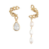 These earrings add a sculptural twist on a gold chain with classic pearls and a contrasting oversized crystal drop. Enjoy an effortless cool mismatched look with this asymmetrical pair– easy to dress up or down.