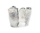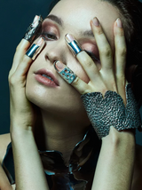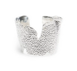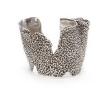 The Lithop Hand Cuff fits the hand like a glove. The Lithop Hand Cuff features the signature hand-carved Lithop texture and dramatic fracture details. The Hand Cuff is designed for the left hand and slips on. High polished or oxidized silver-plated bronze.