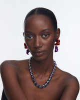 The Fold Earrings are sculptural drop earrings in vibrant folds of metallic Ruby and Violet.