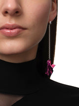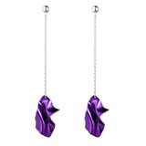 The Gelsey Earrings are lightweight drop earrings featuring a vibrant metallic violet form suspended from sterling silver chain.