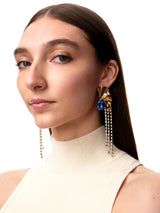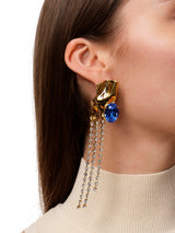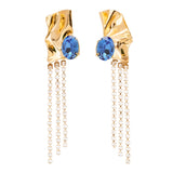 The Kiki Crystal Drop Earrings feature a dazzling combination of a sapphire blue gemstone in a polished gold setting with cascading rows of crystals.