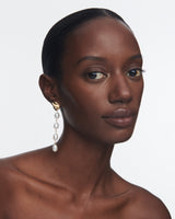 The Pearl Drip Minis are lightweight, dangling earrings that feature a Molten Gold stud with four dangling freshwater pearls. Wear them during the day with hair down and a casual top; transition to the evening by tying your hair up to elongate your neck and highlight these elegant earrings.
