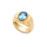 The Ripple Signet Ring features a vibrant blue topaz. The oval gemstone is burnished in a tapered signet ring design with a rippled surface design.