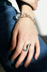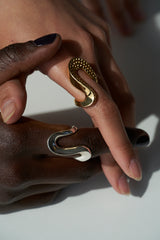 The Serpentine Wave Ring is a winding serpentine-style ring with a shiny Mirror finish. Wear it alone on your index or middle finger to let it shine, or pair it with Ridge Rings for a layered look.