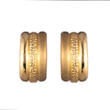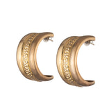 The Trinity Hoops are chunky, layered hoop earrings featuring three distinct textures. The hand-carved Lithop texture is layered between the matte Satin band and the high-polished Mirror finished band.