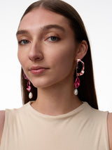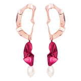 The Inside Out Pearl Drop Earrings are intricate statement earrings featuring shades of pink. The design is complete with a freshwater pearl fastened as the bottom.