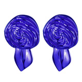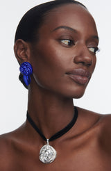 The Rosette Earrings are vibrant blue statement earrings inspired by the delicate textures of silk flowers.
