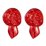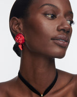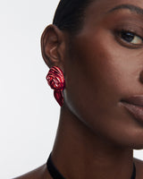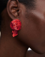The Rosette Earrings are vibrant red statement earrings inspired by the delicate textures of silk flowers.