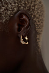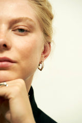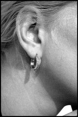 The Lithop Ridge Minis are petite hoop earrings with a hand-carved pointillist texture and wavy Ridge detail that is designed to frame your face.