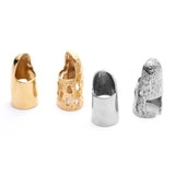 The Helmet Ring is a signature Sterling King style embellished with a hand-carved textured design. The Helmet Ring is a unique fingertip ring, characterized by its cutout silhouette that's designed to encase the end of the finger. Wear one for a subtle but chic metallic look or add one to each finger to create a powerful statement.