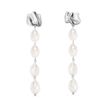The Pearl Drip Minis are lightweight, dangling earrings that feature a molten sterling silver stud with a dangling string of pearls. Wear them during the day with hair down and a casual top; transition to the evening by tying your hair up to elongate your neck and highlight these dangling, elegant earrings.